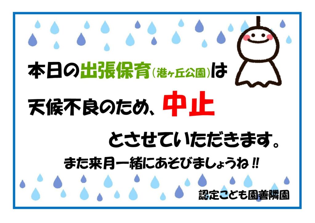おはようございます。本日の出張保育は天候が不安定のため、残念ですが中止とさせていただきます。 お出かけの準備をしてくださっていたお友だち、保護者のみなさまごめんなさい。 次回の出張保育は来年2月4日(水)です。また一緒に遊びましょう! 12月17日(水)は善隣園で開放保育もありますので、ぜひ遊びにきてくださいね。