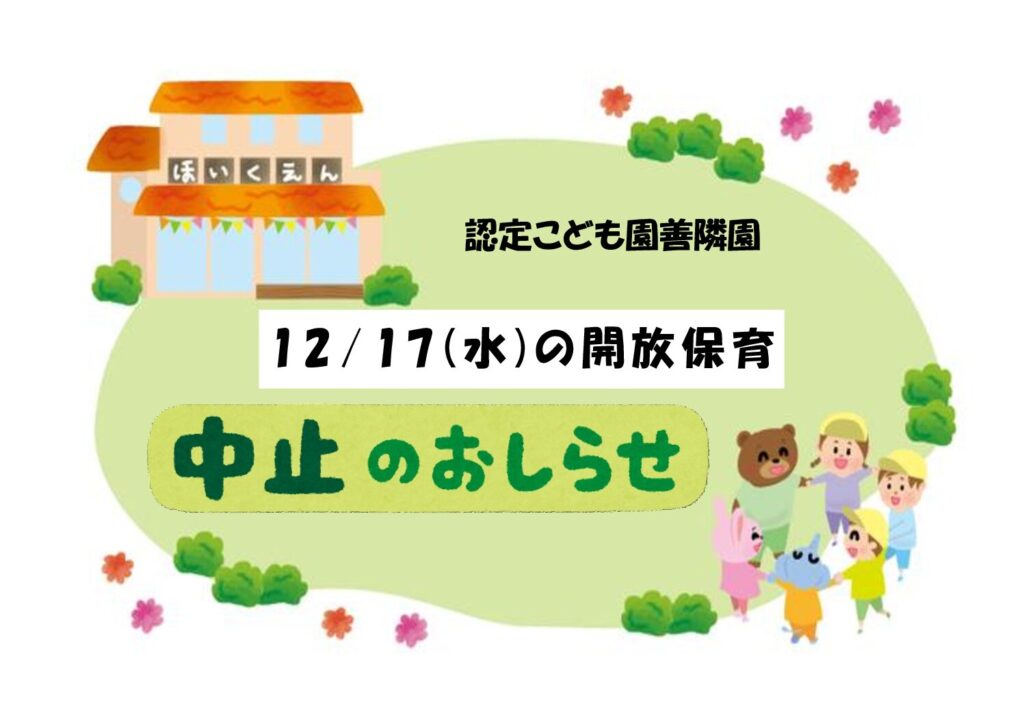 こんにちは。皆さん体調をくずされていませんか?。 善隣園では園内で感染症が流行し始めています。感染拡大防止の観点から、参加者の健康と安全を考慮し、明日12月17日(水)の開放保育は中止とさせていただくことにしました。 年内最後の開放保育だったので、とても残念です。次回は来年1月21日(水)になります。 たのしい、わくわくできる遊びを用意して待っています。ぜひまた遊びにきてください。